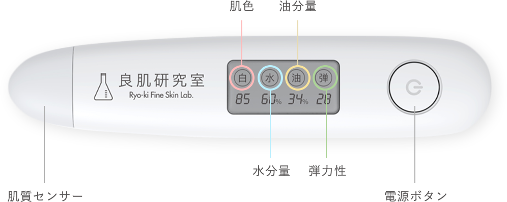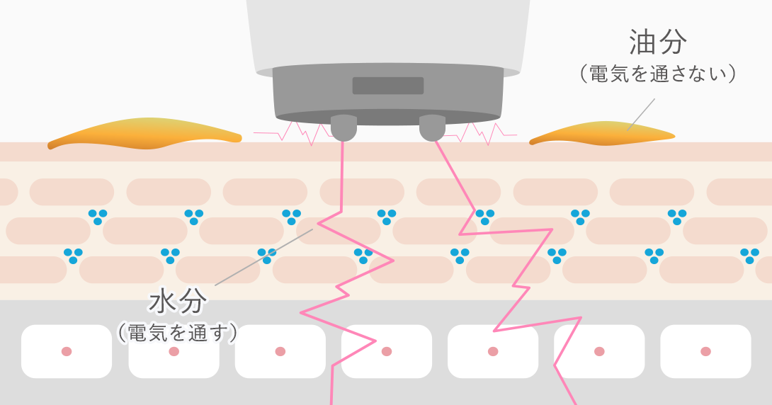 先端にある2本の肌センサーから人体には影響のない微弱電流を発生。水分と油分の通電量の違いから角質層の水分量や表皮の油分量を導き出します。