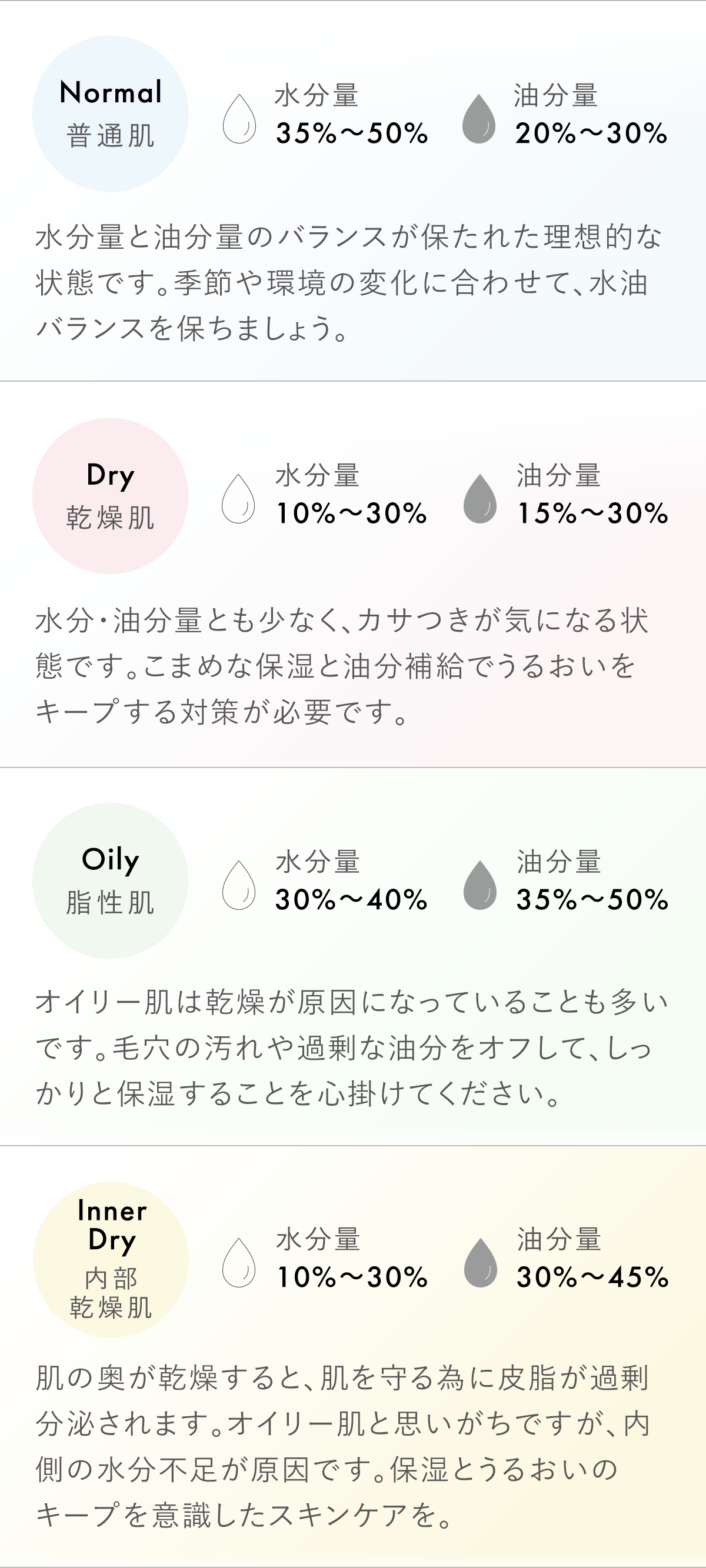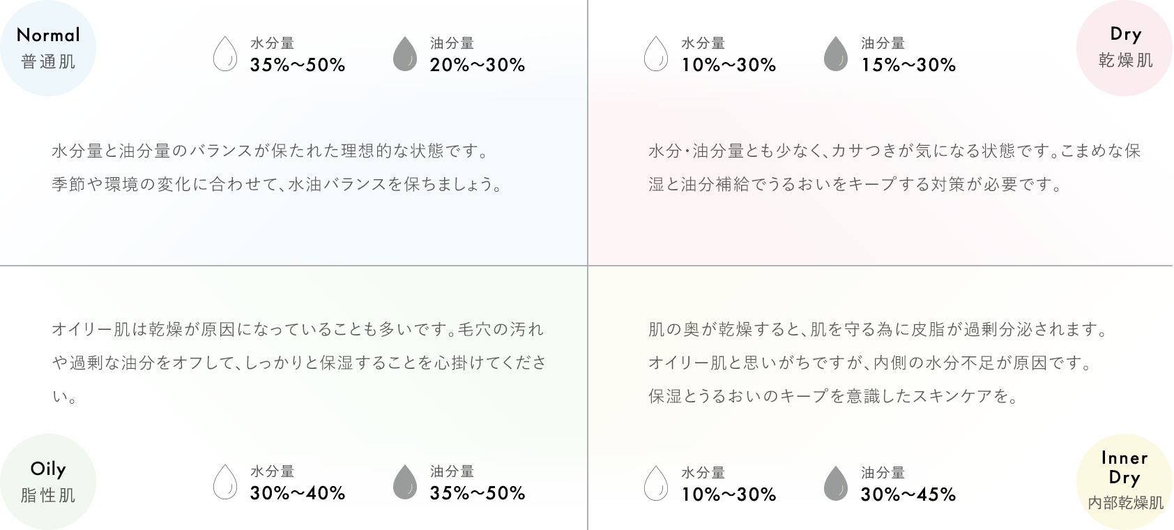 肌質は大きく4つに分類されます。まずは現在の肌質を確認してください。